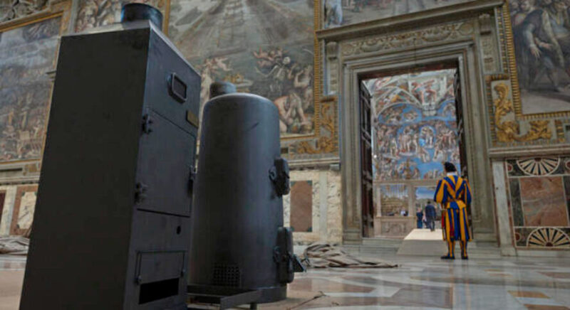 Oltre la cancellata marmorea del presbiterio vengono montate le due stufe: una per bruciare le carte della votazione e una per gli additivi coloranti del fumo: per la fumata nera perclorato di potassio, antracene e zolfo; per la fumata bianca, clorato di potassio, lattosio e colofonia.